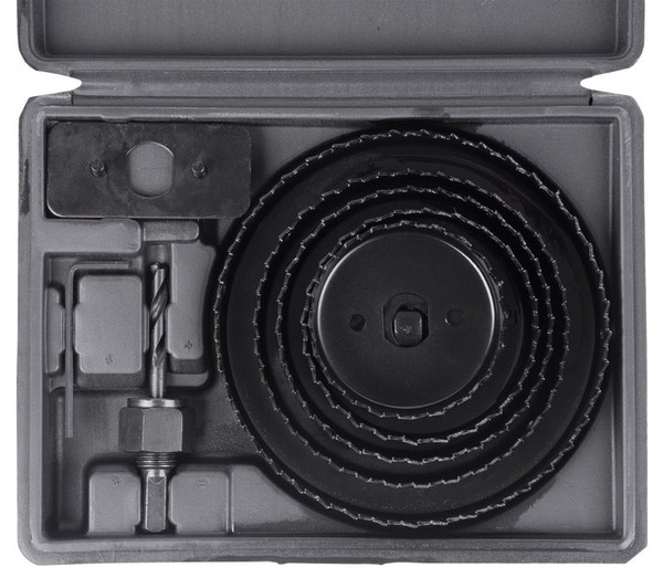 12 ks děrovaček: 19 mm, 22 mm, 29 mm, 51 mm, 64 mm, 76 mm, 89 mm, 102 mm, 127 mm 2 ks trnů 1 ks šestihranný klíč 1 ks unášeče
