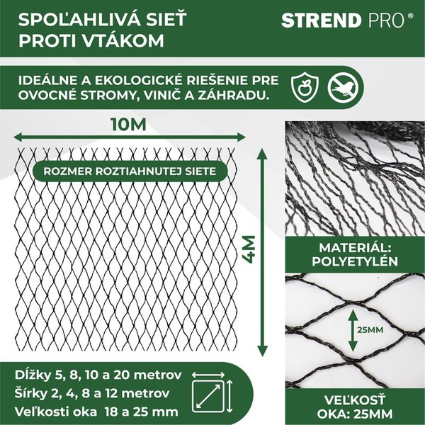 Určené k ochraně ovocných stromů, keřů a hroznů před ptáky. -Velikost oka:25 x 25 mm -Rozměry:4 x 10 m -Materiál:PE